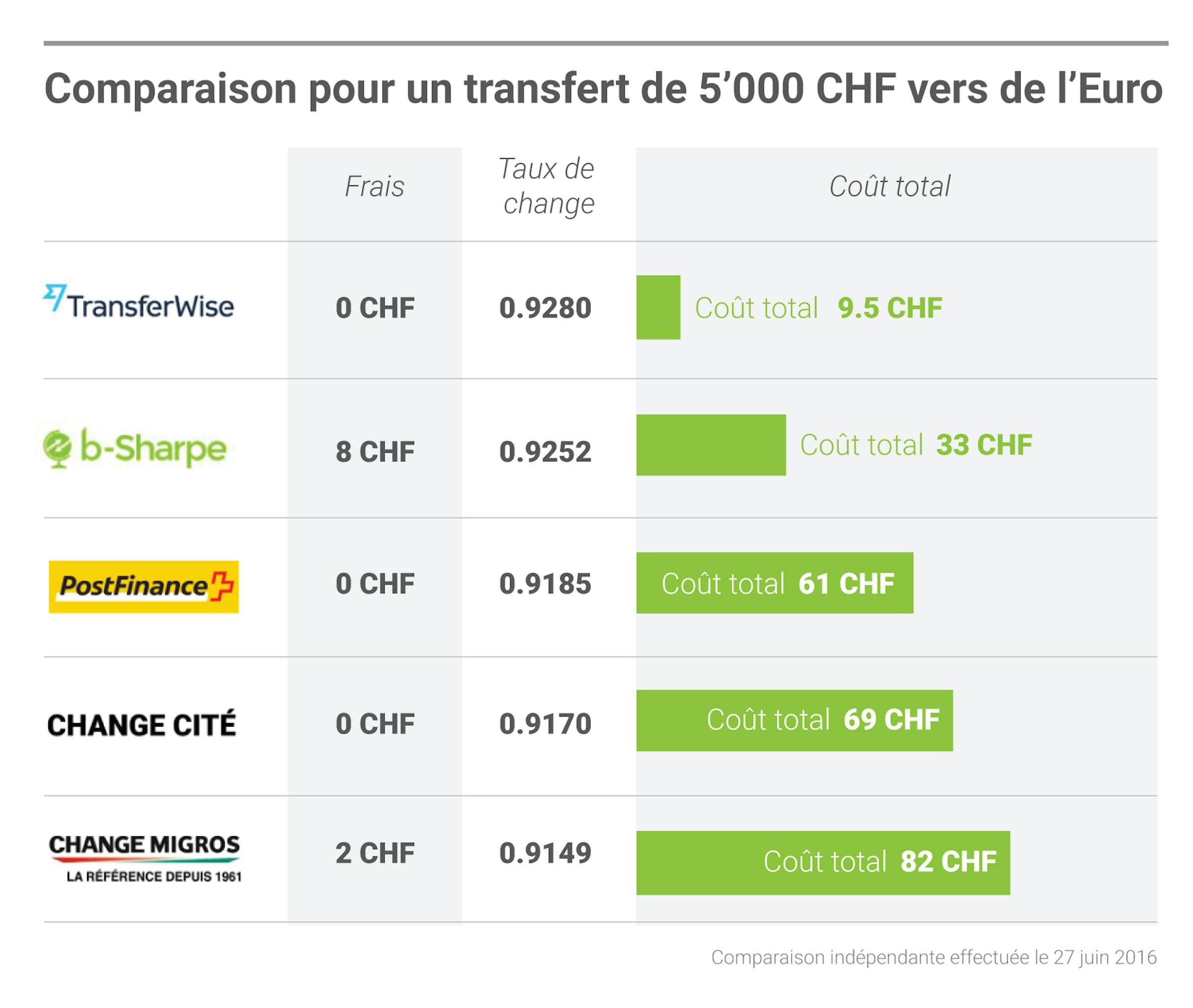 Quant au taux de change EURCHF il devrait évoluer latéralement ces prochains mois réduisant la nécessité dinterventions sur le marché des changes pour dévaluer le franc suisse. Loption la meilleure marché est en ce moment Change Migros avec aucun frais de transferts ainsi qu un taux de change CHF-EUR compétitif le taux de change actuel de Change Migros est de 1 CHF 09055 EUR. Nous listons 3 entreprises disponibles pourtransférer des euros pour un retrait en personne dans une agence.